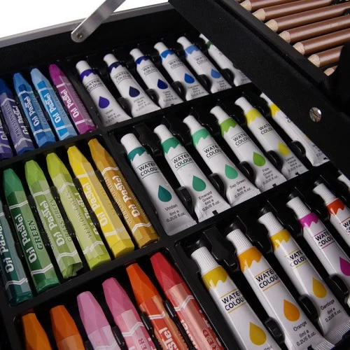 • Totul într-un singur loc – creioane, pasteluri, markere, culori acrilice și acquarel