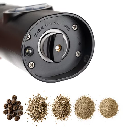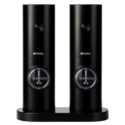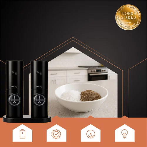 Set de morișcă electrice de culoare neagră aduce confort, precizie și control total asupra condimentelor în bucătărie. Mecanismul ceramic asigură măcinare perfectă fără gust metalic, în timp ce puterea de măcinare ajustabilă permite ajustarea densității de la sare de mare la piper cayenne. Iluminarea LED facilitează dozarea condimentelor chiar și în condiții de iluminare slabă, iar fereastra transparentă oferă o imagine de ansamblu asupra cantității de condimente rămase.