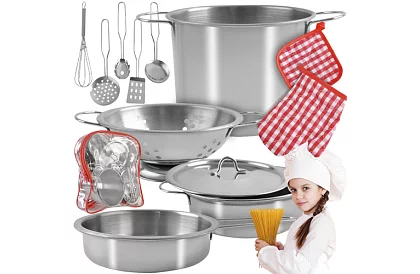• 13 elemente – oale, tigaie, strecurătoare, capac, lingură, polonic, tel, suport din material textil și mănuși