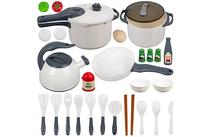 • Multe opțiuni de joc – oale, tigăi, tacâmuri, legume și condimente