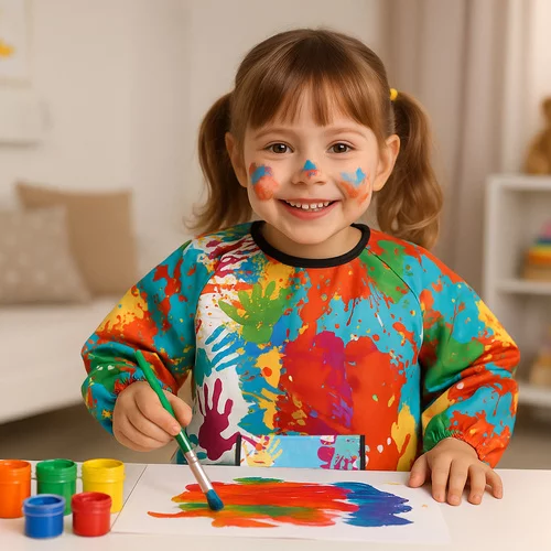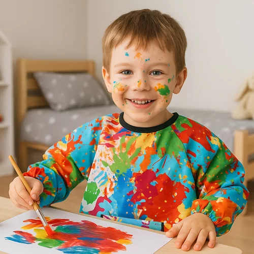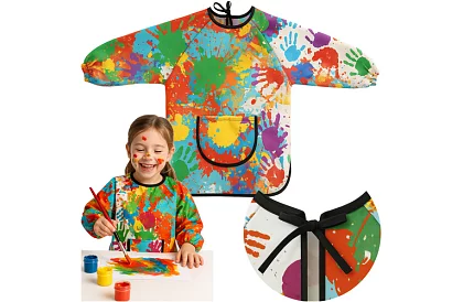 Practică pantalon de pictură protejează îmbrăcămintea de vopsea, lipici și cerneală și permite copilului să creeze liber. Mâneci lungi și croială liberă oferă o acoperire completă, în timp ce manșetele elastice și legarea la spate asigură o purtare confortabilă. Întreținerea ușoară și materialul rezistent permit utilizarea pe termen lung acasă și la grădiniță. Designul colorat atrage micii artiști și îi motivează să se joace activ și să creeze creativ.