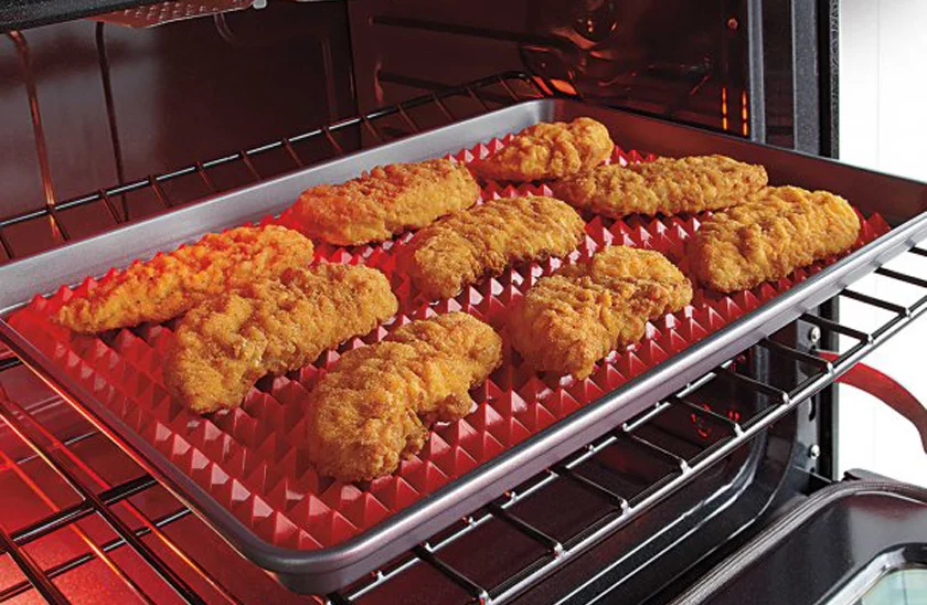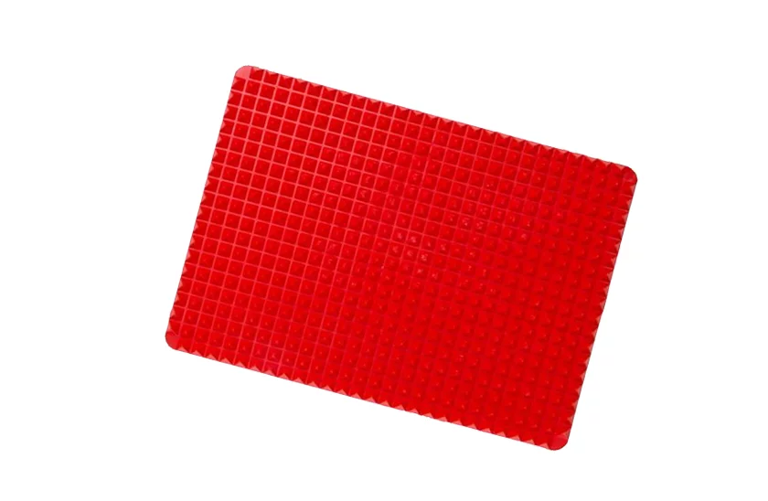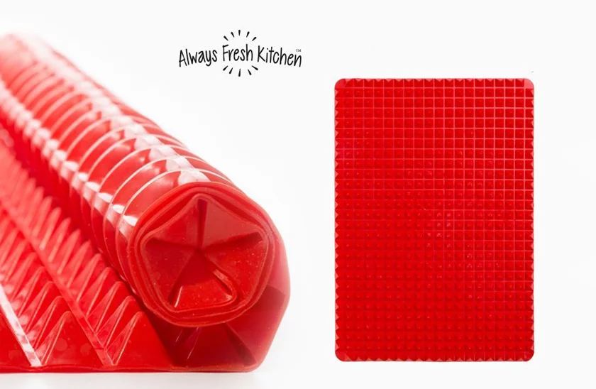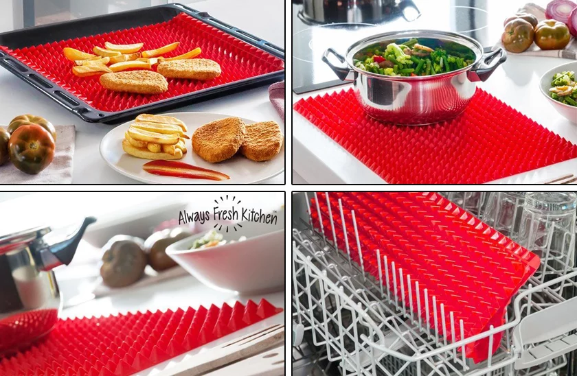 Puteți uita de hârtie de copt Acest suport de copt, din silicon, este un instrument util în orice bucătărie. Tratamentul de suprafață vă permite să scăpați ușor de surplusul de grăsimi. Tot ce veți prepara va fi crocant și copt uniform, aerul fierbinte circulând din toate părțile printre piramide. Suportul de poate fi utilizat și sub vase fierbinți. Se curăță foarte simplu, fiind suficient să se clătească cu apă fierbinte sau să se spele în mașina de spălat vase.