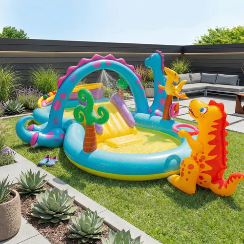 Transformați grădina într-o lume aventuroasă plină de apă și distracție, unde copiii se pot bucura de mișcare și răcorire în zilele călduroase. Combinația de piscină, tobogan și efecte de apă oferă activitate fără plictiseală, în timp ce designul moale și sigur asigură confort la fiecare utilizare. Datorită motivului jucăuș cu dinozauri, copiii vor adora imediat locul de joacă și vor putea să se joace ore întregi.
