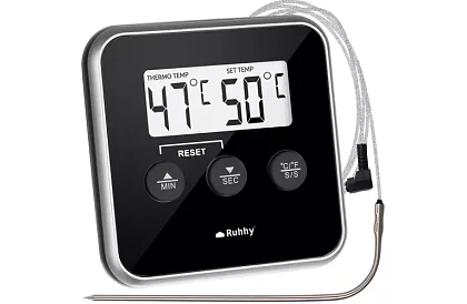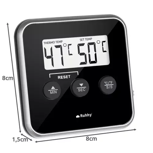 Acest termometru este ajutorul ideal pentru pregătirea cărnii, lichidelor sau uleiurilor și vă permite să controlați cu ușurință temperatura cu o precizie de până la un grad. Ecranul LCD mare și clar asigură o citire ușoară a valorilor, în timp ce magnetul de pe spate permite fixarea termometrului pe suprafețe metalice, cum ar fi frigiderul, cuptorul sau grătarul. Funcția de alarmă sonoră vă va avertiza imediat ce temperatura atinge valoarea setată, iar cronometru practic facilitează urmărirea precisă a timpului de gătire.