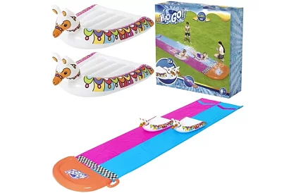 Transformați grădina într-un centru de distracție de vară cu originala tobogan cu apă Lama Rama, care va oferi copiilor multă mișcare, râsete și răcorire. Toboganul cu două piste, cu o lungime de aproape 5 metri, este ideal pentru curse și joacă în comun. După conectarea furtunului de grădină, se activează dușurile cu apă, care mențin suprafața alunecoasă și fac plimbarea mai plăcută. Pachetul include, de asemenea, două saltele gonflabile în formă de lamă pentru și mai multă distracție.