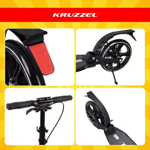 Trotineta pliabilă oferă o călătorie stabilă și confortabilă pentru copii și adulți. Roțile mari din cauciuc și rulmenții de calitate ABEC-9 asigură o mișcare lină, o rezistență redusă și o depășire ușoară a denivelărilor. Sistemul de frânare dublu împreună cu suprafața antiderapantă crește siguranța, în timp ce înălțimea ajustabilă a ghidonului permite adaptarea la diferite staturi. Structura ușoară din aluminiu și mecanismul rapid de pliere facilitează transportul și depozitarea, ceea ce este ideal pentru utilizarea zilnică în oraș.